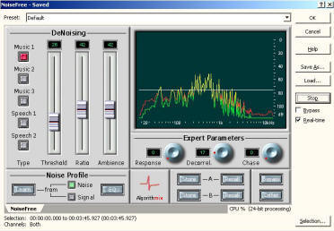 annoying echo or jitter.REMOVING BROADBAND NOISE BACK TO TOP OF PAGE Once the impulsive noise has been removed, you are left with "broadband" noise. This is noise of a continuous nature such as the surface noise of a phonograph record or the hiss on a tape recording. Just as with impulsive noise there are hardware units and software plug-ins that can remove this kind of noise. There are differences in the specific approaches taken by various software companies in designing their broadband noise filters, but most work the same way. You first locate a sample of noise in your WAV file and take a "snapshot" of it. Based on that snapshot the broadband noise plug-in creates an FFT based filter that mirrors the noise. After that you preview the effect the plug-in will have on the WAV file and fine tune the threshold setting that determines at what amplitude the noise image will be applied and also the degree to which it will be applied, i.e.: How many dB of noise reduction you want to apply. In some cases there are additional controls that determine the size of the FFT window, the attack and release thresholds, etc. The problem is that in many cases the noise while continuous is not constant. So a noise print made at one point in the WAV file may not adequately remove the noise at another point. This can be compensated in part by raising the threshold level of the noise print. If the noise is essentially of the same character but just louder or softer at various points, this technique may provide good results. If not, you may have to divide your WAV file up into sections based on the differences in background noise and create and apply separate noise prints. Ironically, during loud passages, one needs less noise removal as the sound itself will mask most if not all of the noise and during soft passages you may need more noise removal because when the amplitude of the sound is low, you are more likely to hear the noise. I say "ironically" because there are less "bits" assigned to low amplitude areas of a WAV file than to the higher amplitude areas. Because of this, there is less information for the software to work with and it is more likely that some of the sound will be affected along with the noise. One way to increase the bits assigned to the low amplitude areas is to increase ALL of the available bits by recording at a higher bit rate. Many recommend recording at 24 bits rather than 16 bits for this reason. More recent versions of most digital audio editing software have added internal processing at the 24 bit rate or higher regardless of the bit rate at which you recorded the WAV file. This means that the actual processing is in fact done at a higher bit rate and then the final